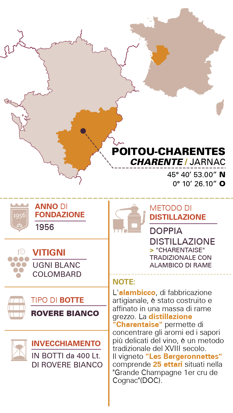 • DISTILLAZIONECognac 100% di denominazione “Grande Fine Champagne 1 er Cru de Cognac”. E’ invecchiato nelle botti di rovere bianco per un minimo di un anno. L’aroma è ottenuto dalla macerazione delle more